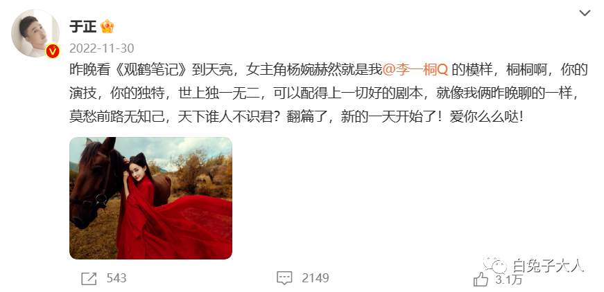 于正也喜欢她,不仅多次为她打call为她战斗,还直接在微博上帮忙跟片方要资源。