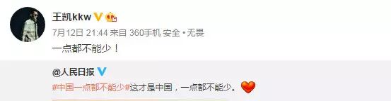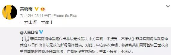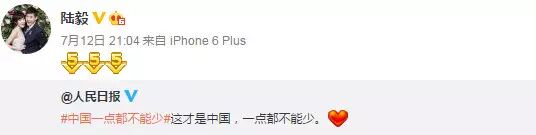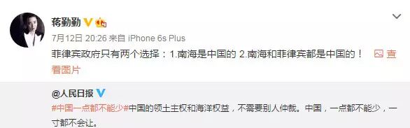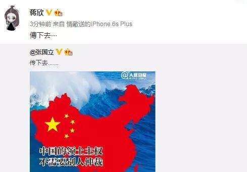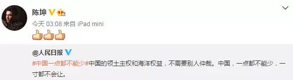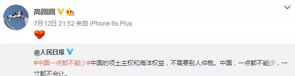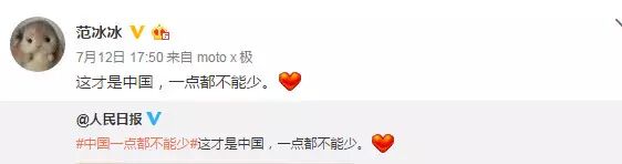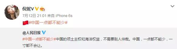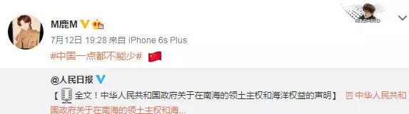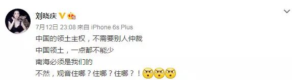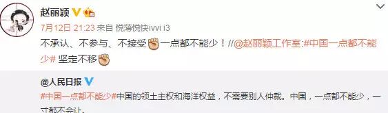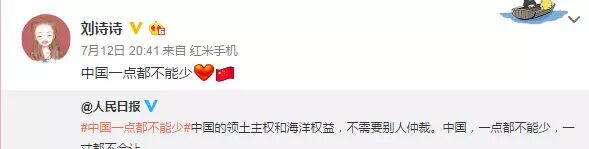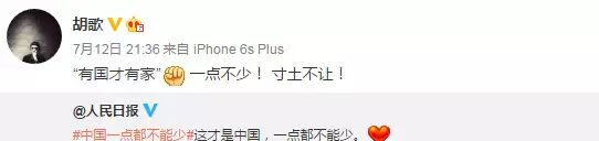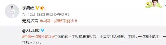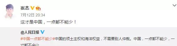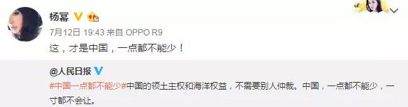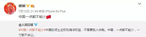 南海仲裁结果惹怒民众,群星更是纷纷在微博转发人民日报贴文“中国一点都不能少”,表达对仲裁结果不满,范冰冰、姚晨、赵薇、黄晓明、刘亦菲、刘诗诗、杨幂等一众明星纷纷发文“一点都不能少”。