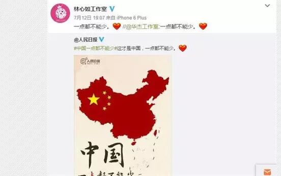 值得一提的是,霍建华工作室在微博转发“中国一点都不能少”博文,有微博博主称他是“第一位发表意见的台湾艺人”,林心如工作室随后也跟着转发。