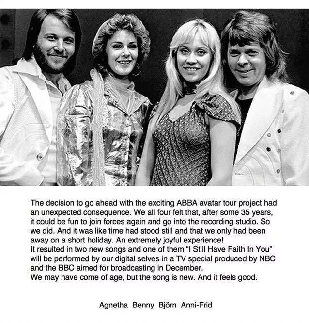 时隔35年,瑞典老牌乐队ABBA宣布即将回归,他们将于12月发行新单《I STILL HAVE FAITH IN YOU 》,这是两首新歌其中一首。 他们自己说:“我们可能已经到了年纪,但这首歌是新的。”