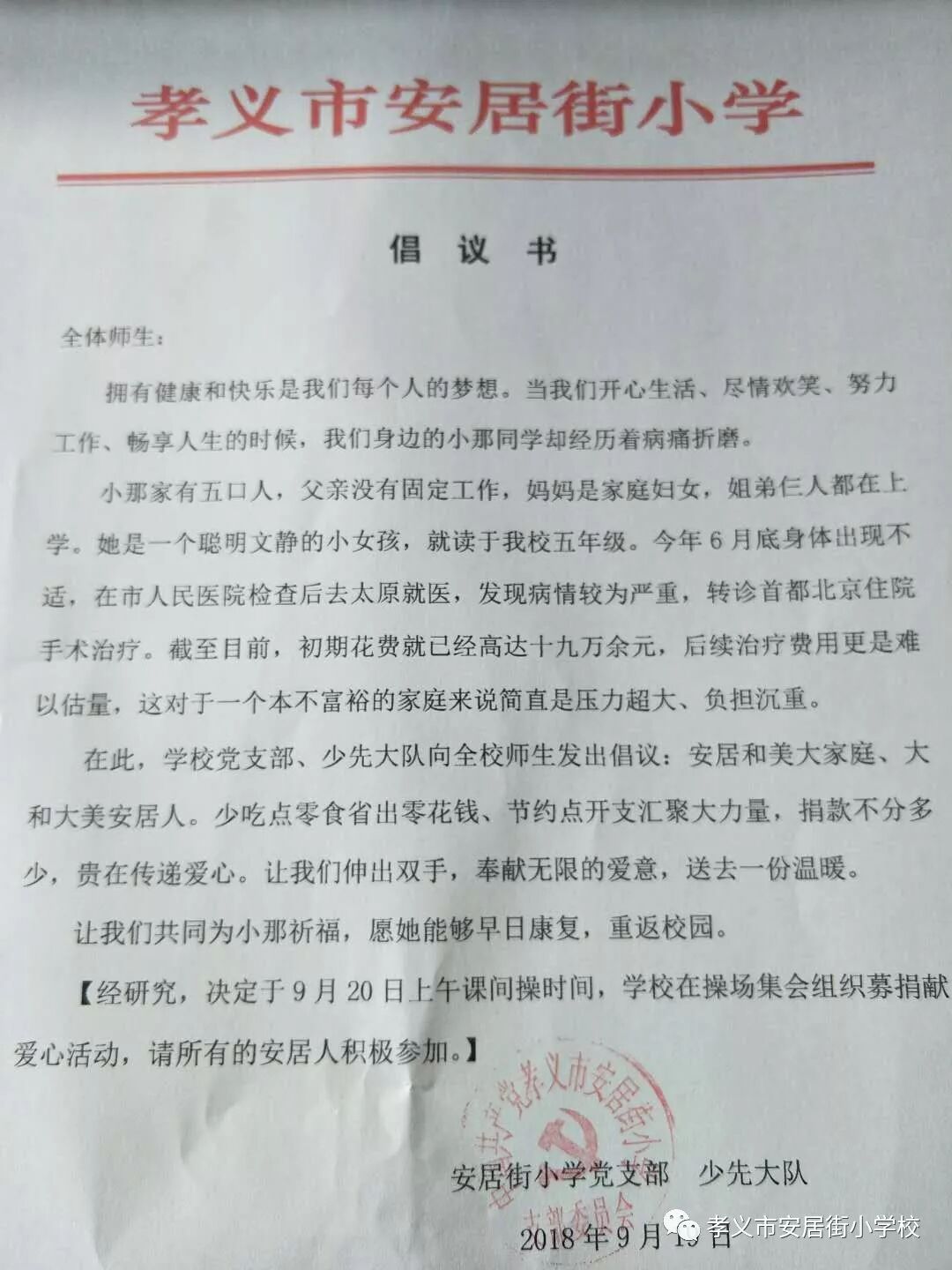 得知小那情况,学校提前安排教师了解孩子情况,核实情况后,学校党支部、少先队向全校师生发出倡议:安居和美大家庭、大和大美安居人。少吃点零食省出零花钱、节约点开支汇聚大力量,捐款不分多少,贵在传递爱心。让我们伸出双手,奉献无限的爱意,送去一份温暖。