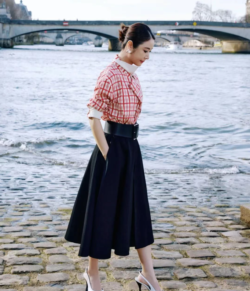 衬衫可以加入各种小设计,比如印花或者格子图案,这件衬衫上的格子让整体更有层次感,看起来不那么单调。三十五岁以上的女性想要穿出好身材,就算穿裙子也要注意突出腰线。现在很多时尚达人都会选高腰款的半裙,这样穿能让腰线往上提,显得腿更长人更瘦。高腰设计还有个好处就是能盖住小肚子,同时让腰看起来更细。