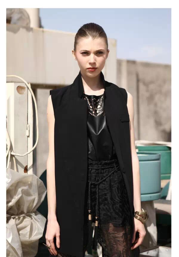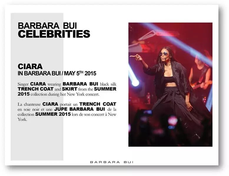 美国纽约----2015年5月5日,美国著名歌手Ciara身着Barbara Bui 2015 春夏系列黑色丝绸外套和短裙亮相纽约个人演唱会。