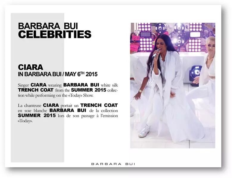 2015年5月6日,Ciara身着Barbara Bui2015年春夏系列白色丝绸外套在电视栏目《Today》中献唱。