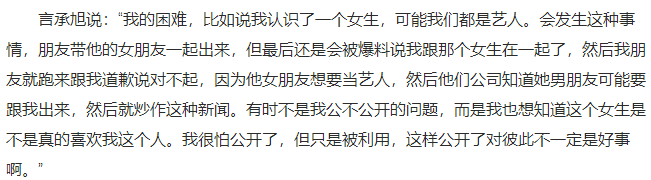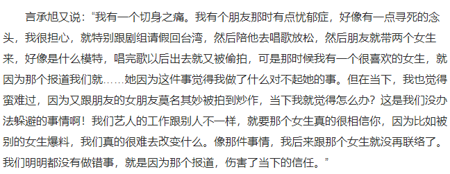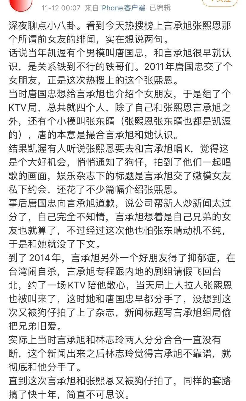 言承旭,别吃回头草了 当时我就震惊了 港台男星 2020-11-15 22:37:36 813 创作不易,用心坚持,欢迎请BaGua喝几杯爱心咖啡!打赏并支持本文 打赏并删除本文 文章来源:吃瓜有料(bajieyl)出道二十几年,绯闻女友还是“老几样”的男明星也是实属少见了。前两天,媒体拍到言承旭和网传分手四年的前女友张熙恩在酒馆聚会。视频里,言承旭的眼神一直紧盯着张熙恩的方向。聚会结束后也同车离开。和“绯闻前女友”同框聚会一点儿不避嫌,难不成是真要“复合”?那,贾玲可咋办?言归正传。视频中的女主角张熙恩,模特出道,之前曾在一些偶像剧里演过小配角打打酱油,被台媒称为台版“全智贤”。不过单从照片来看,除了名字都是三个字以外,和全智贤可以说是毫不相干了。2011年,两人就被拍到过同去KTV唱歌,当时张熙恩还是言承旭好朋友唐国忠的女朋友。2014年再次在KTV同框,传出恋情。言承旭还因此事被骂挖兄弟墙角。不过当晚张熙恩的经纪人就出来解释说两人是多年好友,互相接送很正常。2015年,言承旭去东京和加州旅行时,女方也碰巧都在,被台媒拍到称两人在“预支蜜月”。当时言承旭通过经纪公司回应了这次被拍,说“张熙恩是心底非常重要的朋友”。言承旭之前在面对绯闻时一向沉默,这次的解释显得格外特殊。媒体自动把这句话解读成了言承旭认爱张熙恩。之后两人屡屡传出婚讯。但被传了那么多次的绯闻,两人回应的统一说辞都仅限在“朋友”二字,没有真正的公开承认过。在去年的采访里,张熙恩却突然变卦。说自己曾和言承旭交往了两年多,因工作关系聚少离多分的手。自认当时有自卑心理,怀疑“是不是我不够成功、不够红、不够好所以不能承认我?”还夸了一嘴言承旭暖心,分手后还请朋友偷偷来画展买自己的画,支持自己的事业。绯闻炒了那么多年都没认,分手后反倒过来撒糖了。被拍到的事折腾上热搜后,有博主看不下去出来爆料说,是女方故意找的狗仔,目的就是炒作。这料虽然不知是真是假,但绝不是空穴来风。张熙恩突然认爱的时间点就卡在时隔三年重新复出上,之前言承旭的采访里,也看的到疑似炒作的蛛丝马迹。2011年被拍后,唐国忠就曾向言承旭道歉,言承旭想着是自己兄弟的女友也就算了。被爆出偷把兄弟旧爱,言承旭也给出了解释,当时是为了陪一个患了抑郁症的朋友去KTV散心放松,没想到张熙恩也在。言承旭还因这份绯闻错过了当时自己很喜欢的女生。那个“当时很喜欢的女生”,不少人猜测说的是言承旭的旧爱林志玲。言承旭和林志玲自出道起两人的绯闻就没断过。自2002年被拍到过一起看电影开始,之后每隔一段时间,媒体总能拍到蛛丝马迹。05年,林志玲手机送修,“鸳鸯浴袍照”曝光于众。但即便被照片锤得死死的,两人的经纪人还是狡辩“只是朋友”,但浴袍照是怎么来的的说辞却一点也对不上。同年,林志玲意外坠马,断了六根肋骨,险些危及生命。言承旭明知肯定会被狗仔追击,还是去医院看望了。但林志玲伤好之后,这段感情却画上了句号。林志玲上节目被问到言承旭时,突然红了眼睛。言承旭也在节目上说写了很多封情书挽回,但是一封也没寄出去。09年,言承旭出了一本书,《9314男人与男孩》。书里有段小故事暗戳戳的回忆了当年的坠马经历。林志玲参加《快乐大本营》时,何老师曾读了一小段给林志玲听。在听到,“为什么两个相爱的人在受苦的时候想要接近,会那么疼”时,林志玲一边笑一边强忍眼泪。何老师问,“你会觉得好遗憾吗 ”,林志玲回答,“会是个遗憾也是个缺憾。”在这之后关于两人复合的传闻也愈演愈烈。15年的金马颁奖礼上,林志玲和言承旭隔屏同框,击碎不少人的少女心。典礼过后,林志玲还点赞了一条微博,内容是,林志玲的“徐太宇”一直都是言承旭啊,在一起吧。言承旭被问到有没有复合的可能,也松口说,“看她的态度”。两人的世纪大复合似乎成了板上钉钉的事,就差临门一脚了。但在去年,林志玲突爆婚讯。这段折腾了十多年的虐恋终究是意难平了。这些年,言承旭的身边也没再有“新面孔”出现,绯闻来来回回还是之前的那几个。比起什么澄清,料姐更希望这次是真的有好消息了。毕竟,他演了这么多年的偶像剧,这次,该轮到他自己了。【点赞】↓↓↓ 创作不易,用心坚持,欢迎请BaGua喝几杯爱心咖啡!打赏并支持本文 打赏并删除本文 感谢您的支持鼓励,我会继续努力的!文章地址:用户邮箱:打赏金额:USDT 请输入数字点击”去打赏“,即可进行打赏支持本文章哦 言承旭 About the Author 当时我就震惊了 功能介绍:是个有趣的人 官方认证:北京创客互动科技有限公司 Related Posts 花泽香菜,天使的声音 2021-10-23 22:37:46 乌兰图雅:没有我躲不过的“汉子” 2021-07-10 22:37:27 辰亦儒:十年种瓜无人识 2021-05-07 22:51:39 汪苏泷,原来你是这种人 2021-02-22 22:52:14 戚薇你真的不是来拆散这个家的么? 2021-02-20 22:48:50 发表评论