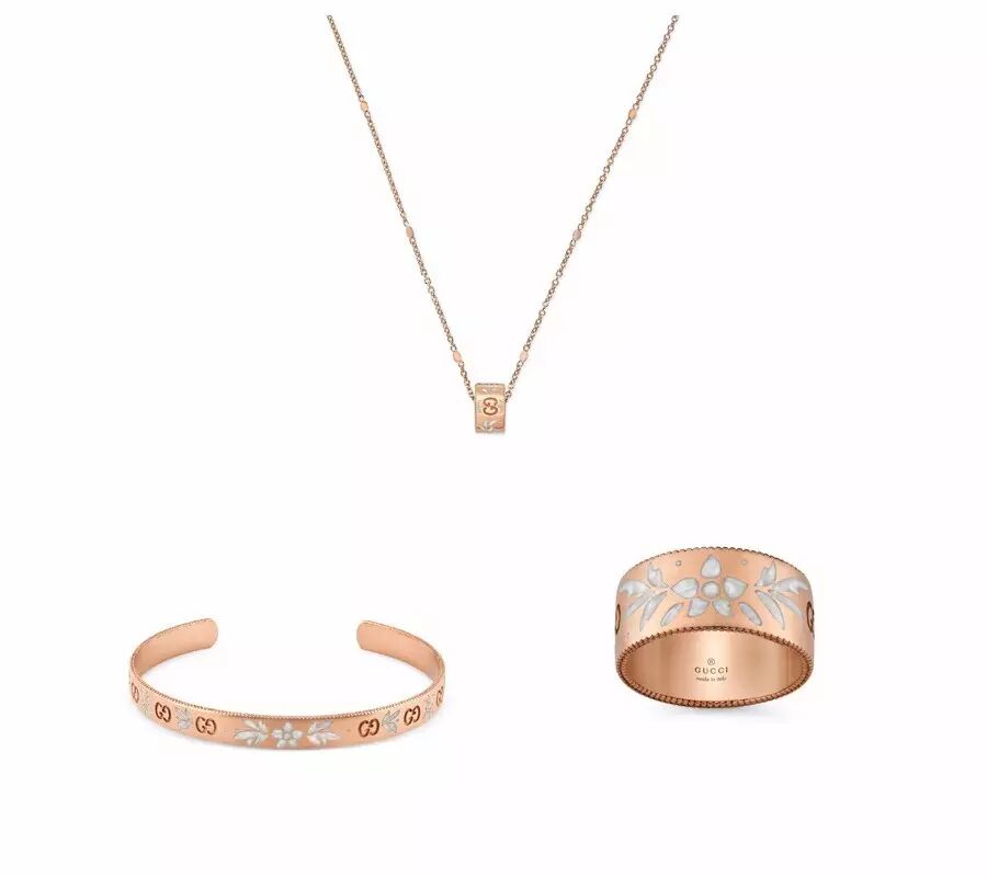 除此以外, 李宇春更化身复古粉红女郎完美诠释Icon系列高级珠宝,包括以精致的花卉图案及18K玫瑰金镶白色珐琅打造出的一系列戒指,手镯和项链。细致的花朵和叶片图案,与品牌互扣式双G标识被镌刻于饰品表面,为这一标志性珠宝系列带来焕然一新的改变。