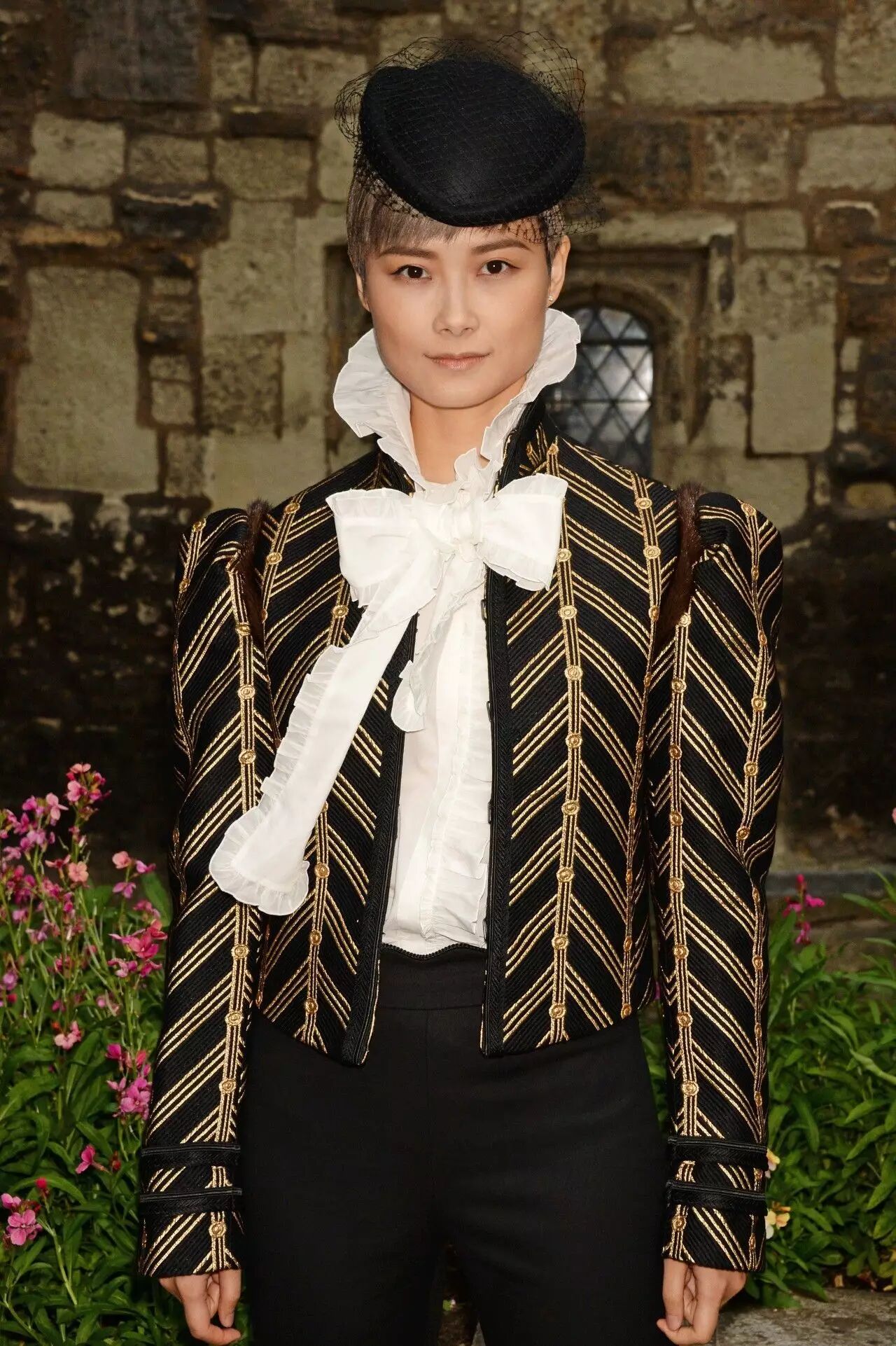 在Gucci 2017伦敦早春系列发布会上,我们也看到了李宇春出现在众多明星当中。一件金色提花短款夹克内搭白色丝绸罩衫,无论是胸前的蝴蝶结造型还是头上那顶歪戴的小礼帽都透露出一股贵族气息。