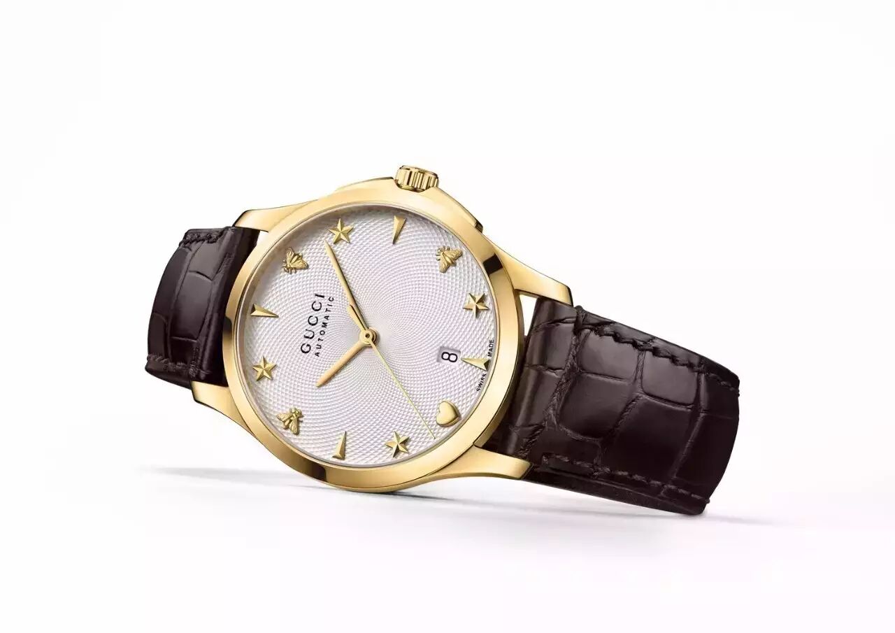 而在另一张腕表大片中,李宇春则佩戴了G-Timeless系列自动腕表,该系列表盘饰以蜜蜂,心形及星星图案作为时标,是糅合品牌夺目创意和瑞士高级制表工艺传统的结晶创作。