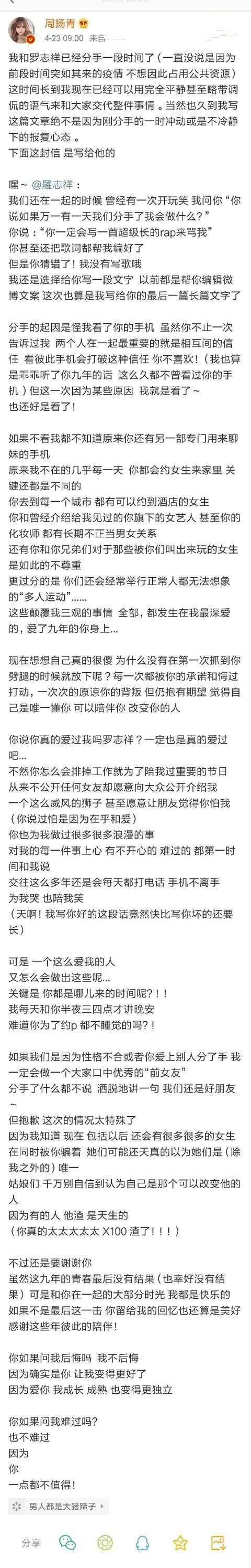 然而到了2020年,已经和罗志祥相恋9年的周扬青忍无可忍了。她在4月23日在社交平台发文揭开了罗志祥的“真面目”,她说她和罗志祥分手了,是因为她看了罗志祥的手机,还发现罗志祥有一个专门用来撩妹的手机。她说罗志祥和旗下的女艺人还有化妆师长期保持不正当的男女关系,说她一不在家,罗志祥就约炮,罗志祥去外地也是各种约,而且还直言罗志祥和他的朋友们一起做多人运动。周扬青坦言自己不应该在第一次发现罗志祥出轨而选择了原谅他,她说罗志祥是十足的渣男。
