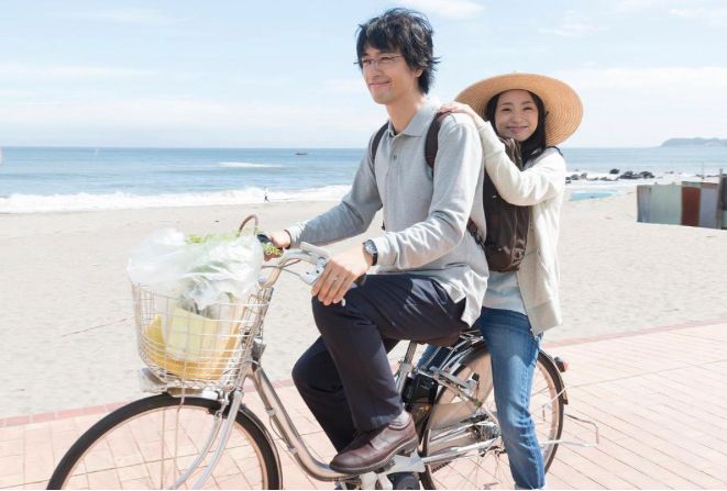 在海边骑着单车,笑着闹着: