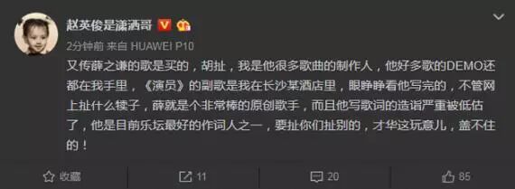 近日有爆料称薛之谦花钱买歌,赵英俊19日发文辟谣,称自己是薛很多歌的制作人,《演员》副歌是自己看着薛写完的。他直言薛之谦是个非常棒的原创歌手,其写歌词的造诣严重被低估,“他是目前乐坛最好的作词人之一,要扯你们扯别的”,力挺薛之谦。