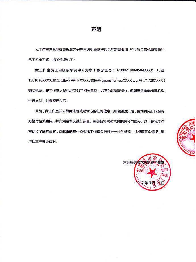 据海淀法院消息,张艺兴5月通过代理商购买两次飞机票,票款合计人民币22865元,机票均已正常使用,但票款经代理商多次催要至今仍未支付。代理商认为张艺兴拖欠机票款的行为已构成违约,遂起诉其要求支付票款及经济损失2.6万。目前法院已受理此案。张艺兴工作室发声明否认,称员工已支付了相关票款给采买中介刘某,但刘某并未支付给出票机构,且人已失联。并表示如有需要,愿意先行垫付费用。机票代理商经理回应媒体表示,“机票是一位姓刘的人订票的,5月份的票款拖欠至今拒不付款,根据机票合同只能起诉乘机人,起诉时不知道是张艺兴”。