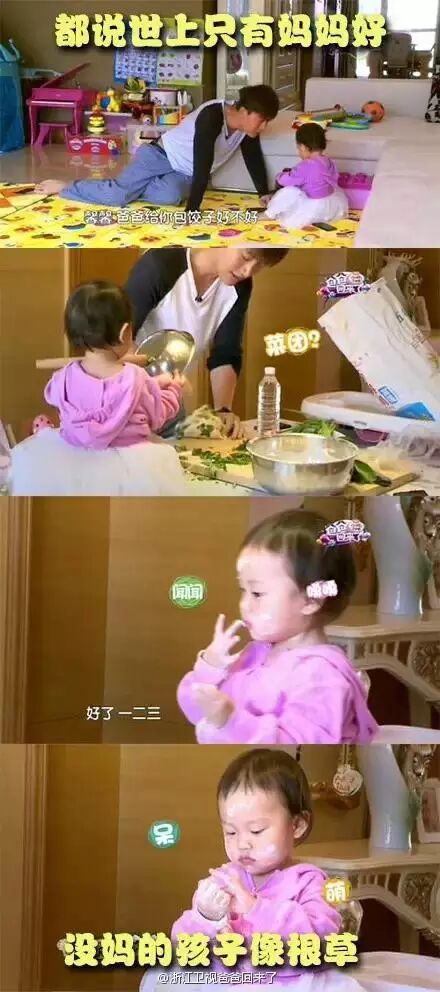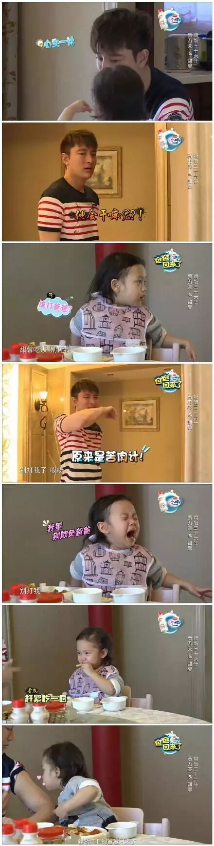 贾爸爸做不到智商上的碾压,于是只能装柔弱。人生在世,全靠演技。为了让甜馨吃饭,简直拿出了看家本领,电视剧里都没看他表演的这么卖力。可是您老人家有这功夫,能不能把食物做得好吃一点呐!