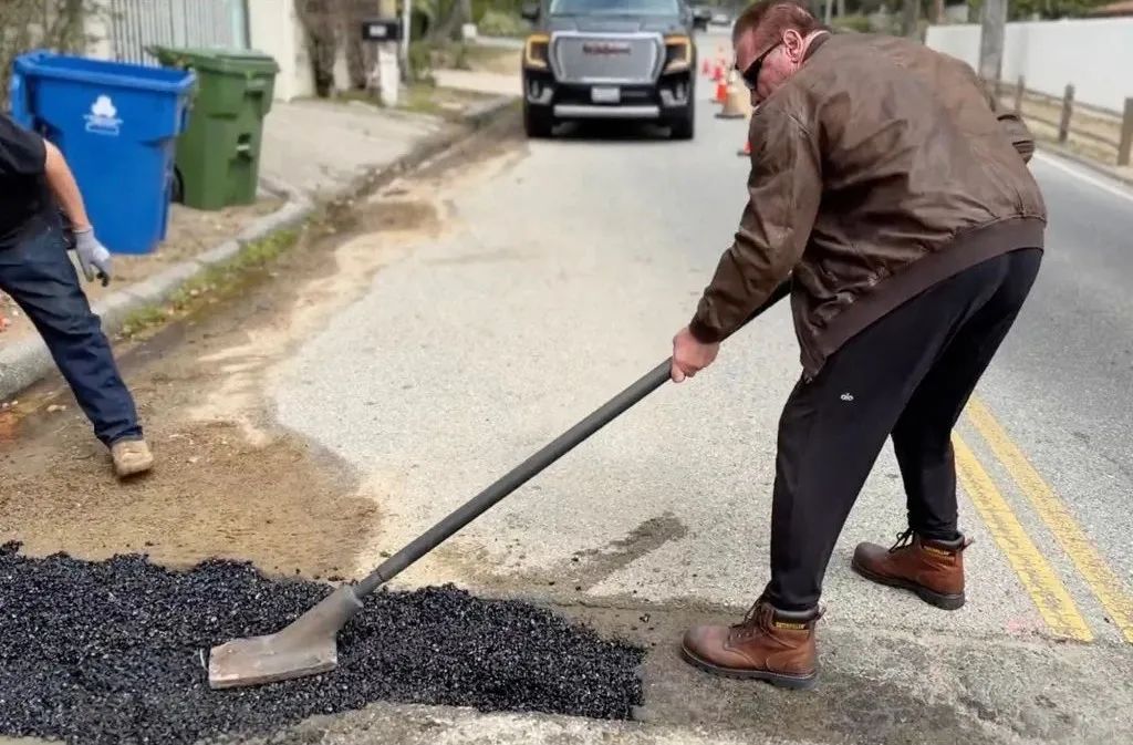 视频中,施瓦辛格亲自带人用沥青填平了社区道路上的坑洼处。图源:外媒