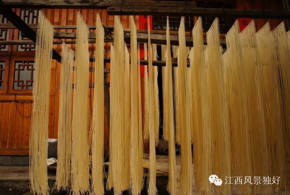 宗山米粉是南昌市安义县黄洲乡宗山龙村的传统产品,历史悠久。据清同治十年(1871)《安义县志》载:“(米粉)出处多,宗山最好。”它以优质米为原料,经过浸米、磨浆、滤干、采浆、捏团、蒸果、碾团、压丝、晾干、漂洗、摊晒等十几道工序制作而成,具有洁白细嫩、久煮不糊、久炒不碎、爽韧可口等特点,为安义地区酒宴席上的头道菜肴,也是南昌米粉中的精品。