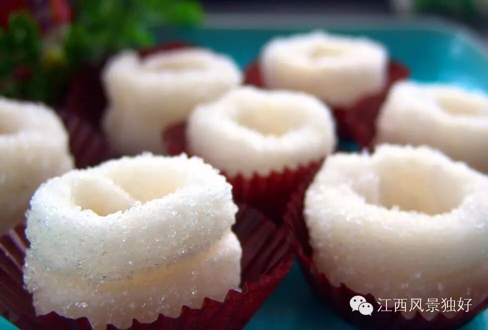 具有千余年历史的白糖糕,也是南昌民间十分受欢迎的传统小吃。白糖糕的原料有3种:干的糯米粉、冻米粉和绵白糖。先将冻米粉用碓舂后过筛,再用20%的细嫩冻米粉、80%的绵白糖,加上等糯米粉,用开水泡好搅拌成粉团,搓成三股盘形圆环,用温油文火炸,起锅后再在绵白糖之中打一个滚。白糖糕吃起来香甜可口,色泽金黄松软,是南昌茶楼常备的佐茶食品。