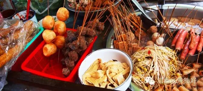 来南昌旅游,可以随处见到大街小巷旁的油炸小吃摊:有的摆在小车上,有的放在路边,事先准备好的有豆腐干、小香肠、小青菜、海带卷、肉条、香蕉、圆藕片、鸡杂等,用小竹棍串好。然后,您可以随意选择,选好后,由摊主放在滚沸的油锅内煎炸,少倾取出后,再涂上辣椒调味品,便可以领略到颇具特色的街头油炸小吃,可以细细品尝,也可以边走边吃,价格便宜,令您回味无穷。