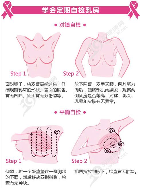 我们可以定期用如下方法自检乳房,不过最好的是定期去医院检查:
