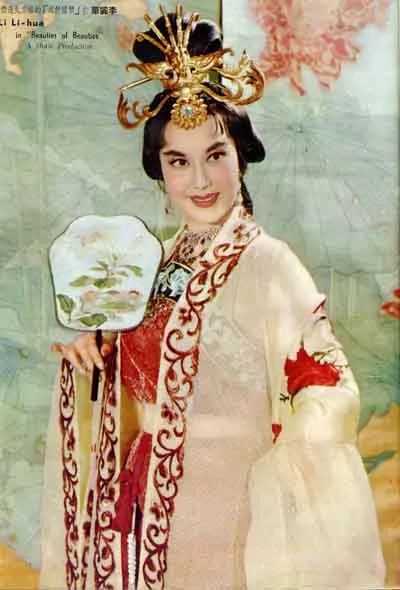 《扇中人》并不是专业说杨贵妃的,而是改编自《聊斋志异》中的《阿绣》。剧中有一段戏中戏,乐蒂依次化身“四大美人”——貂婵、杨贵妃、西施、王昭君。虽然当年的服化距离“历史”太远了,但乐蒂真的就一个字——美!