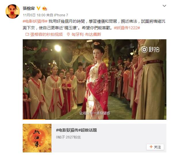 话说,张榕容演的混血杨贵妃,多少人接受是一回事。但作为演员,她很用心啊——不仅学礼仪、学弹琵琶(其实公映版里根本没出现弹琵琶的戏份)……