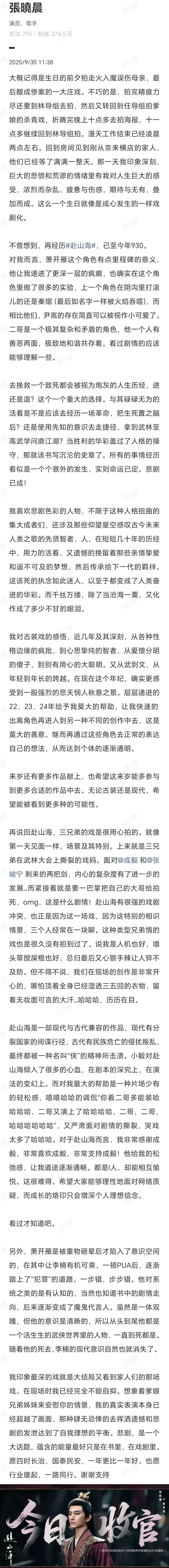 《赴山海》收官这天恰好就是张晓晨生日,张晓晨对这个角色理解也很深刻,洋洋洒洒写了千字长文,说二哥是复杂矛盾的角色。内心有善恶两面在博弈,黑化的助推就是李楠的穿越。