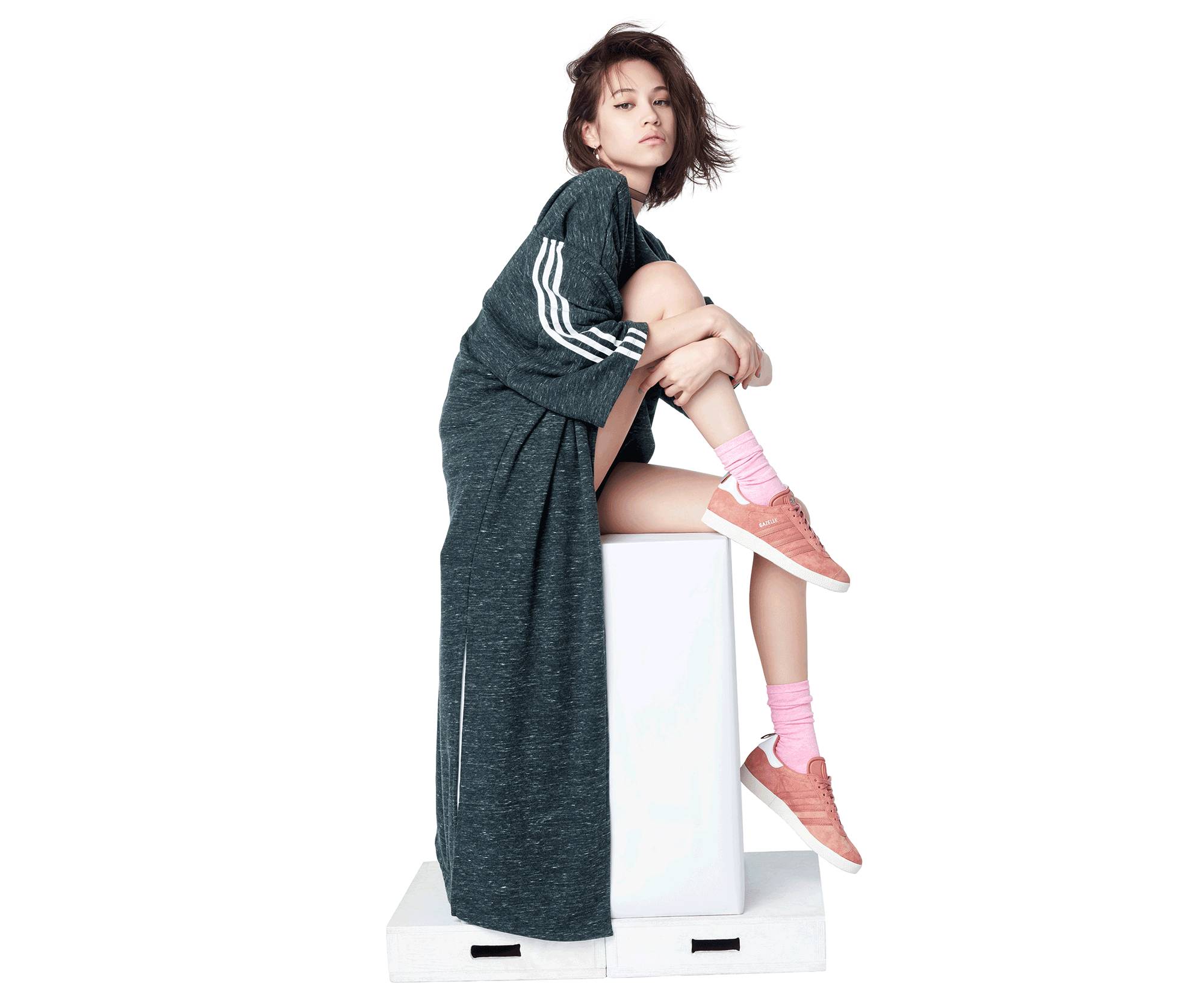 之前她给adidas Originals的GAZELLE系列拍摄的硬照特别撩,照片中的Kiko穿着宽松的运动服,配上条纹长袜,脚踩adidas GAZELLE,酷酷得很青春。