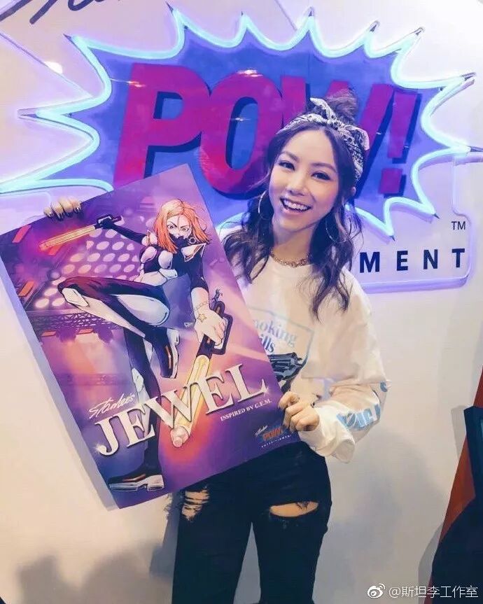 漫画海报上Jewel身着紧身战衣,手中拿着犹如光剑般的武器,非常炫酷。微博还晒出了邓紫棋的各种合影,看出来GEM相当喜欢这个超级英雄。