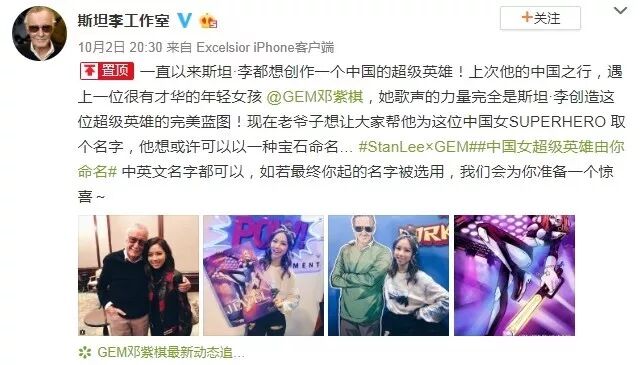 10月2日,“漫威之父”斯坦·李的官方微博发文表示,10月1日斯坦·李动漫宇宙展上公布的全新超级女英雄“Jewel”,就是以邓紫棋为原型。