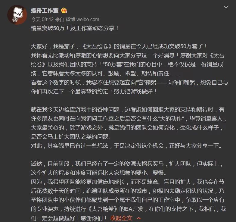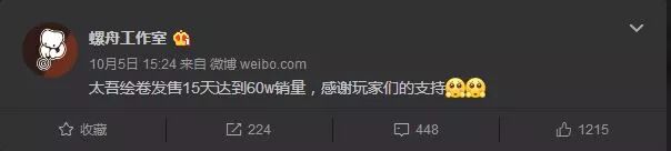 10月5日,国产独立游戏《太吾绘卷》官方微博表示,该作在steam上游戏销量突破60万。