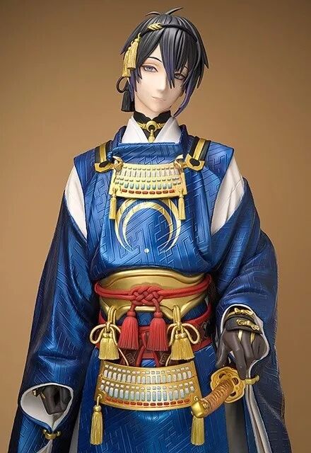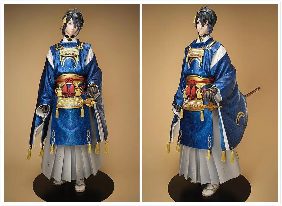 本商品以约1800mm的高度,将被称为天下五剑中最美的三日月宗近,制成与人身同等大小的立体模型,以1比1尺寸才有的精密造型,重现其绚烂华丽的衣饰,藏青色和服以多达三层的涂装工程制作,呈现出厚重质感。