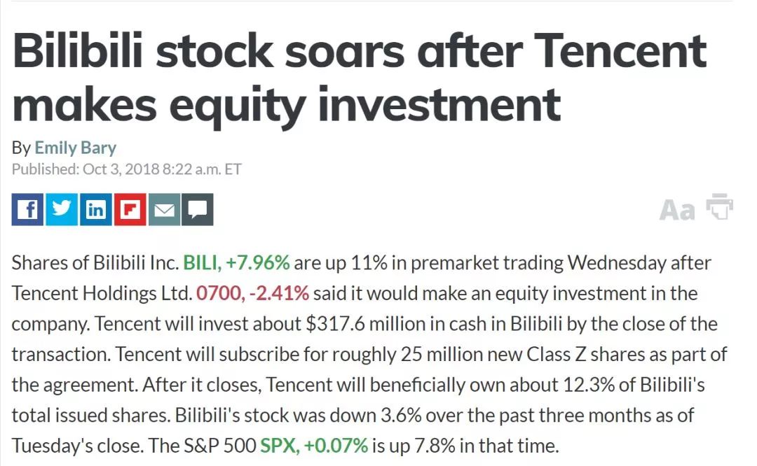 10月3日晚间,腾讯和B站宣布,双方已达成协议,腾讯控股将对哔哩哔哩进行共3.176亿美元现金的投资。