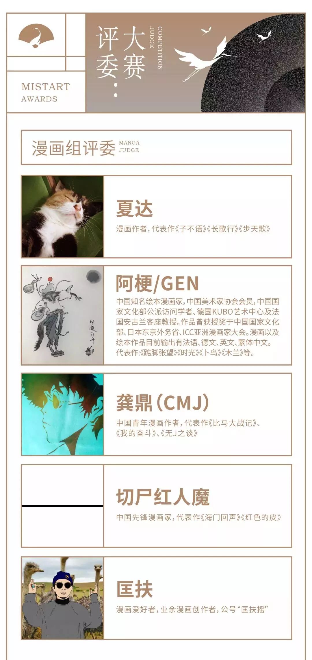 漫画组的评委嘉宾有著名漫画家夏达、阿梗、龚鼎、切尸红人魔、匡扶,插画组评委则有著名插画家倪传婧、幻电放映、DEO.R、钱议、李超雄。