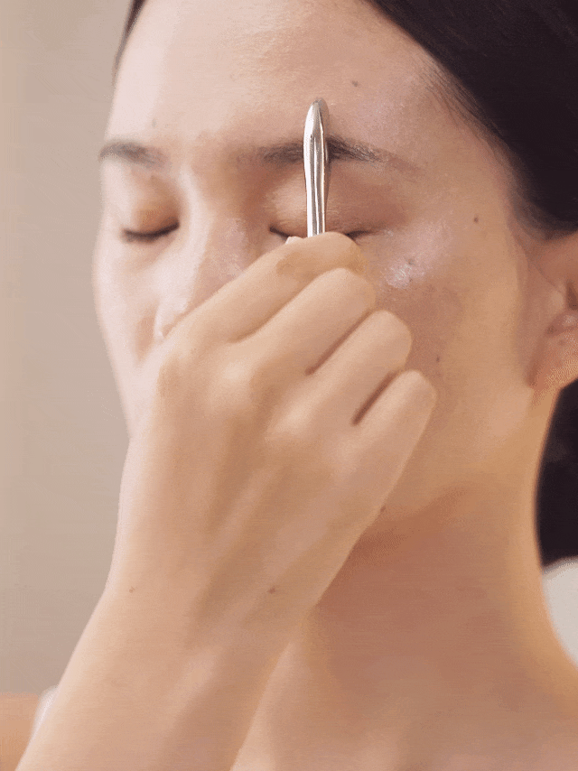STEP4: 用小银扇从眉头到眉尾方向轻柔按压,轮刮眉骨。