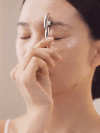 STEP2:用小银扇的扇面部位,从眼头向眼尾方向,以45度角由内向外轻柔轮刮眼廓,促进眼油吸收,“安抚”肌肤。