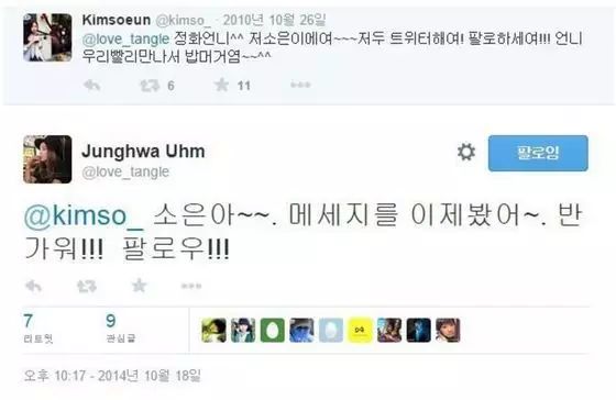 而同样的情况也曾发生在歌手严正化和演员金素恩身上,严正化曾在时隔四年后回复金素恩发给自己的推特,并写道“素恩啊,我现在才看到消息,很高兴见到你”。