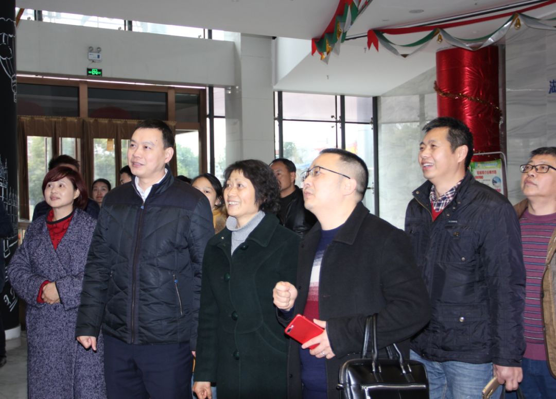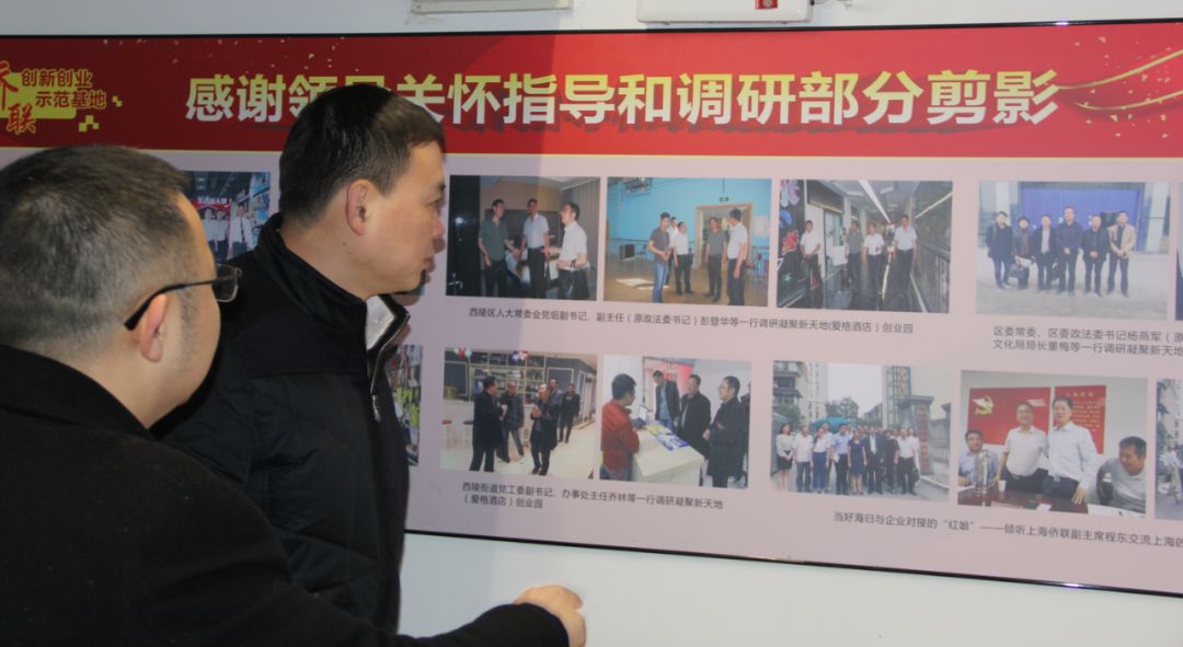 ▲宜昌市侨联党组书记、主席陈红,西陵区委常委、西陵区委组织部长、统战部长文君等一行观看凝聚新天地(爱格酒店)创业园文化墙