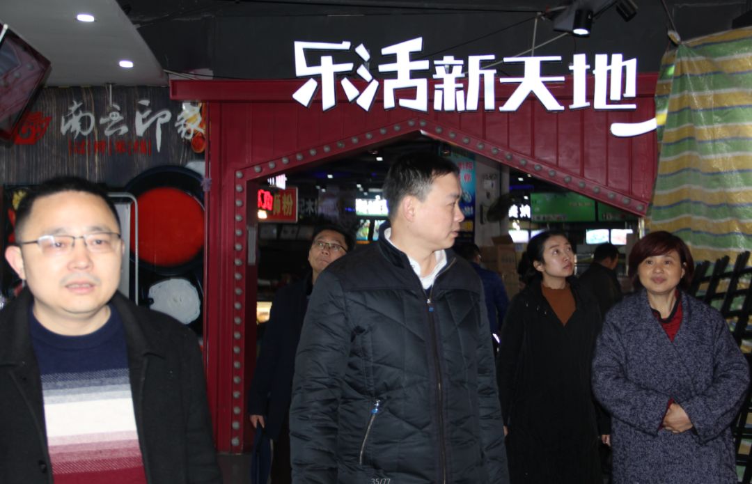 ▲西陵区委常委、西陵区委组织部长、统战部长文君和宜昌市侨联副主席、西陵区委统战部副部长、侨联主席胡华春等一行调研凝聚新天地(爱格酒店)创业园——“美食城”