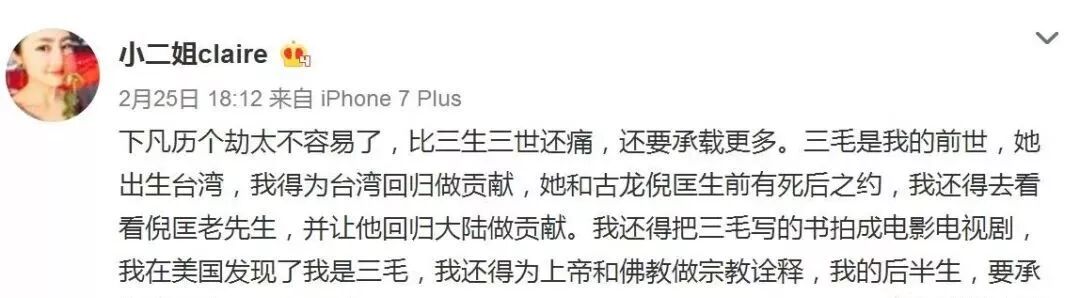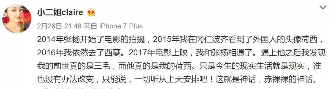 随后,小二姐还举了各种有的没的例子,说明自己和张扬是三毛与荷西转世: