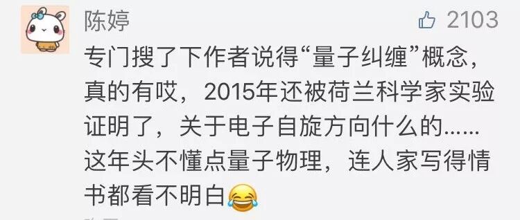 看在文青的面子上,姑娘可能物理没学好,把“量子纠缠”强行拗成了前世姻缘,爱因斯坦都差点气晕在棺材里。