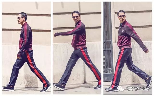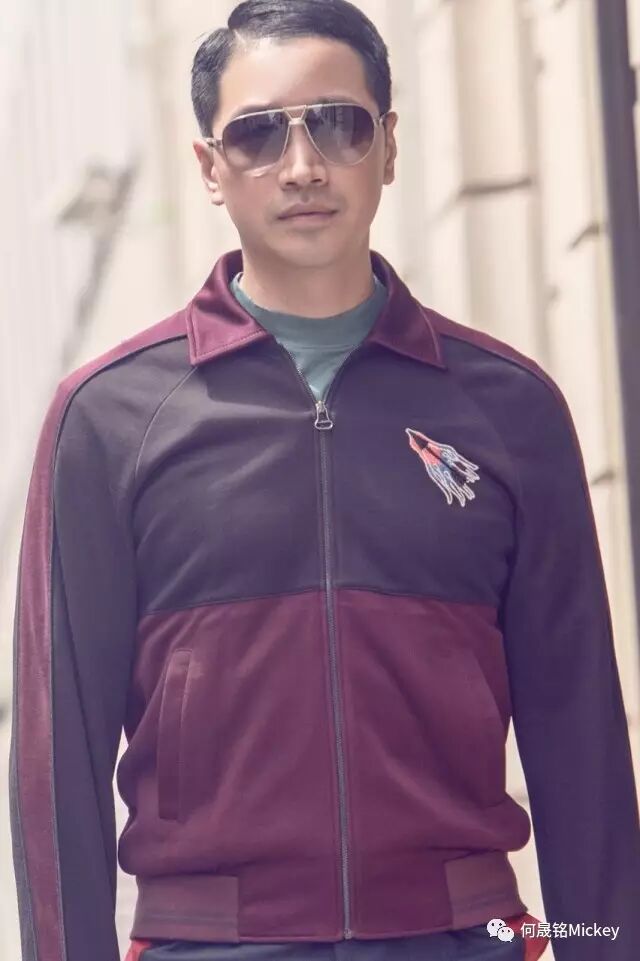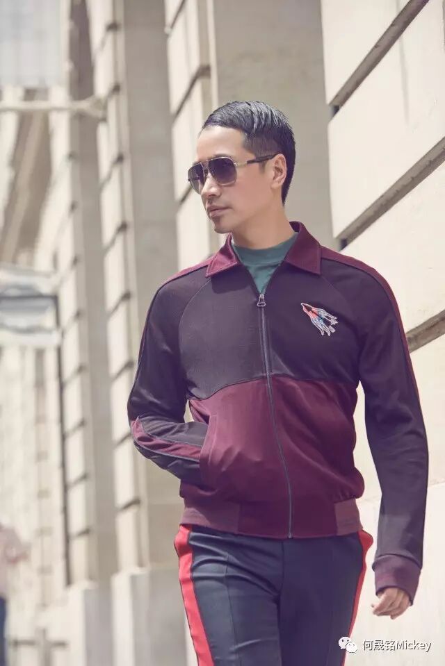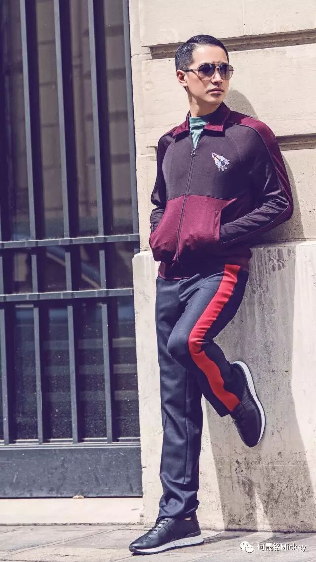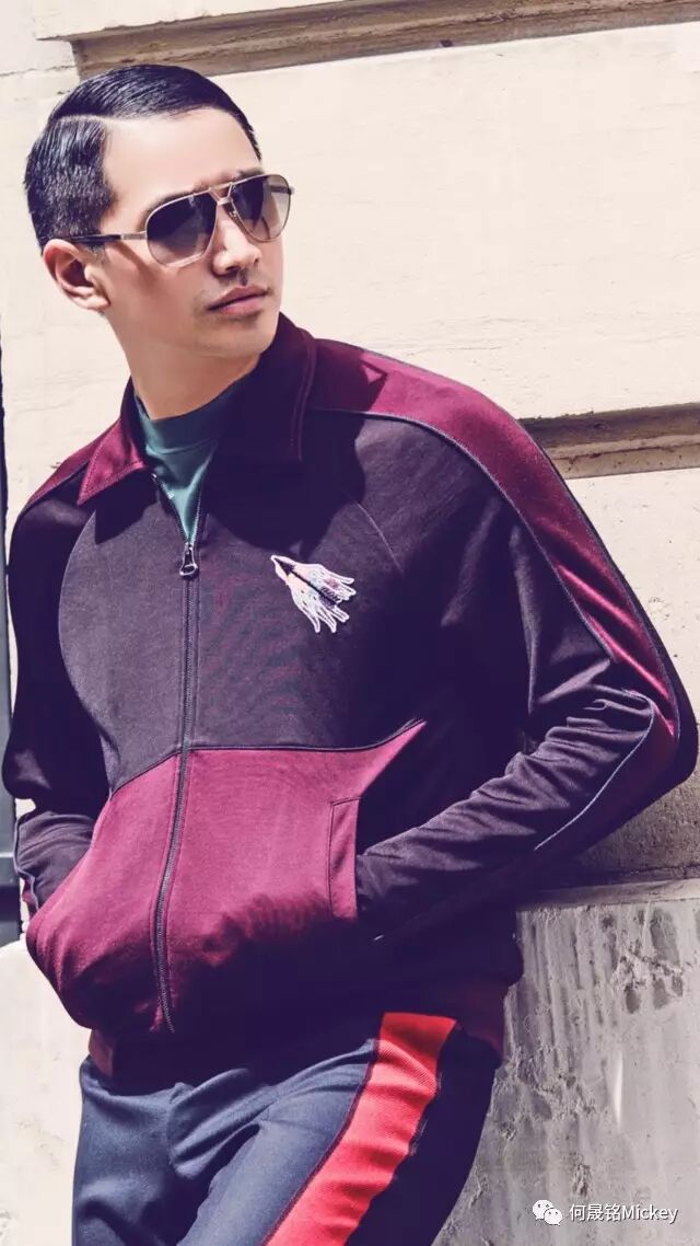何晟铭先生佩戴Lanvin茶色墨镜,身着Lanvin2017年早秋男装系列青色T恤,酒红色拼接夹克,斜纹罗纹修身长裤以及黑色运动鞋。