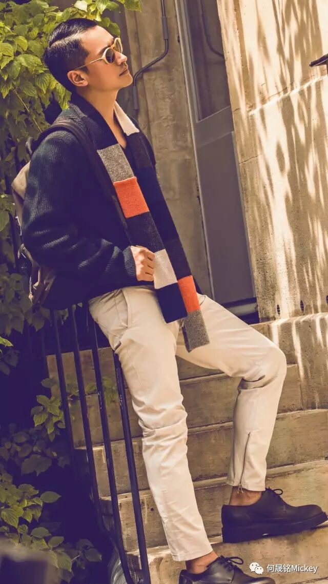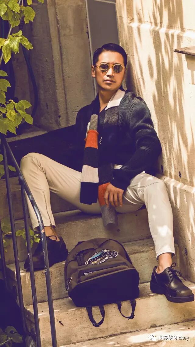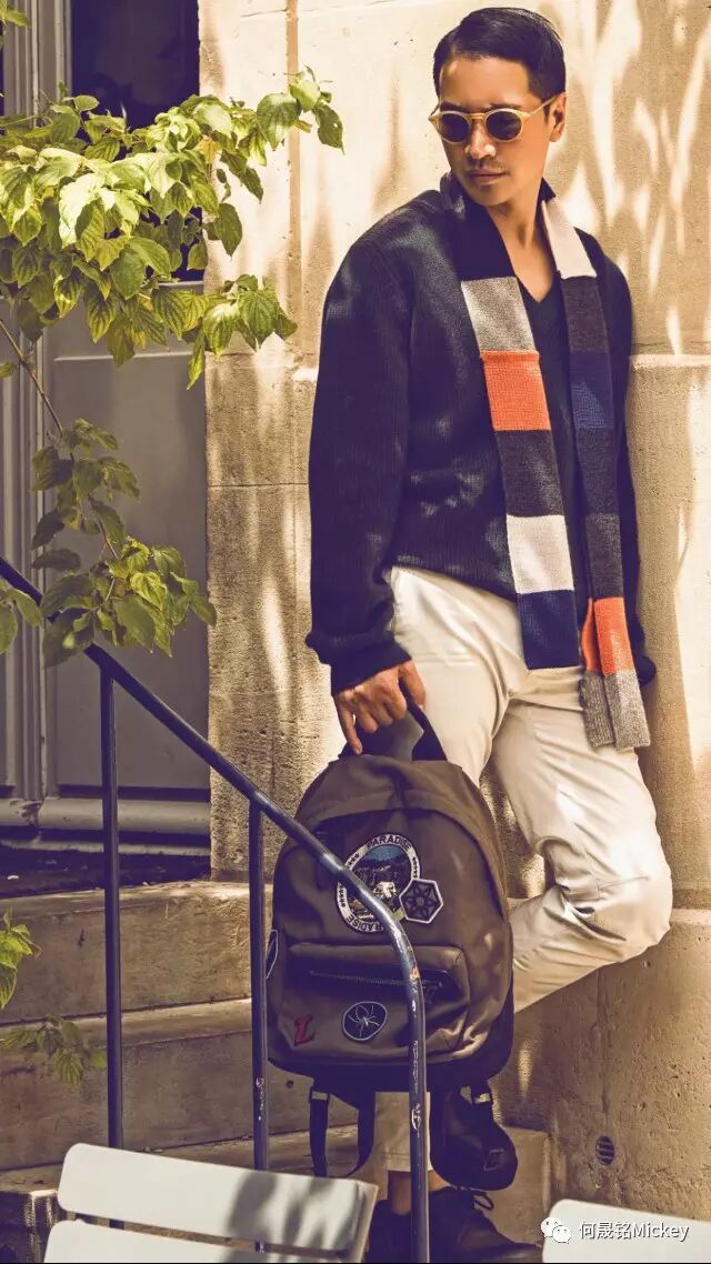 何晟铭先生佩戴Lanvin复古墨镜,身着Lanvin2017年早秋男装系列橄榄绿毛衣搭配撞色围巾以及卡其色刺绣徽章背包,白色长裤和黑色厚底系带鞋。