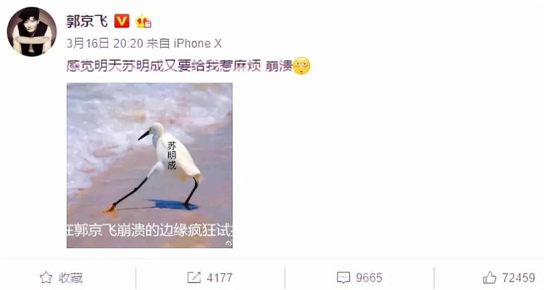 郭京飞的微博,随着“苏明成”的爆黑,不停自黑,网络流行语和对应骚操作一个都不拉下,堪称苏明成黑粉站站姐。
