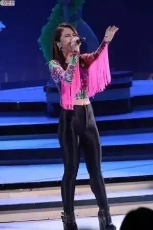 邓紫棋最爱的皮裤出场了,虽然她的腿很粗,皮裤这种越发显腿粗的搭配真不是她的菜,但是她在漫长的舞台岁月中还是一如既往的爱它,真不知道搭配师对她的自信从哪来的。