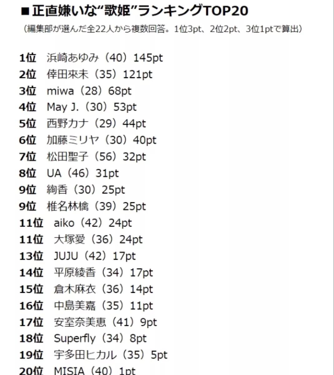 日本娱乐圈竞争激烈,每位明星都尽可能将自己“美好”的一面展现给公众~不过毕竟歌迷的口味众多,艺人们也无法保证自己被所有人喜欢!而据日媒报道,近日《周刊女性》杂志就最新一期的“最令人讨厌歌手”排行榜!榜单由日本网友公开投票,主题就是评选出最不受欢迎的女歌手。而结果比较出人意料:40岁滨崎步拿下“最令人讨厌歌手”榜单冠军!而话题不断的“松田圣子”跻身第七~连红透全亚洲的“日本天后”安室奈美惠也上榜!排在第17~
