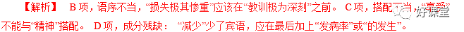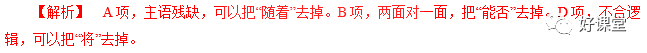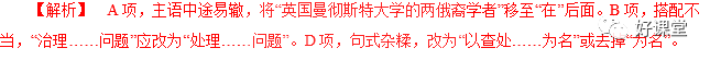 【解析】 B项,句式杂糅,应为“寻找解决……的办法”或者“寻找……破解之道”。C项,成分残缺,缺动词,在“植根于”前面加“有”。D项,搭配不当,“减弱”与“风险系数”不搭配,可将“减弱”改为“降低”。