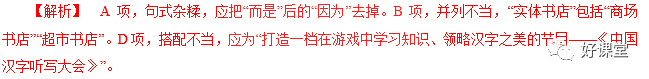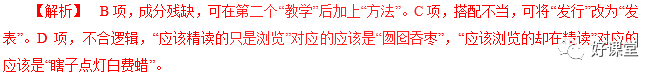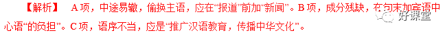 【解析】 第①句前后分句的递进关系弄反了,应该调换一下;②句属于成分残缺,应该是“金庸作品入选中学语文课本”;④搭配不当,“激发……兴趣”可以,但不能“激发……水平”,可以改成“提高……水平”;⑤“几个学校的语文教师”这个短语有歧义,可把“个”改为“所”。