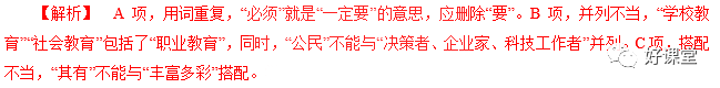 【解析】 A项,成分残缺,句末应加“……的重要途径”。B项,句式杂糅,不能说“目的是为了……”。D项,赘余,“各行业及社会生活的方方面面”重复。