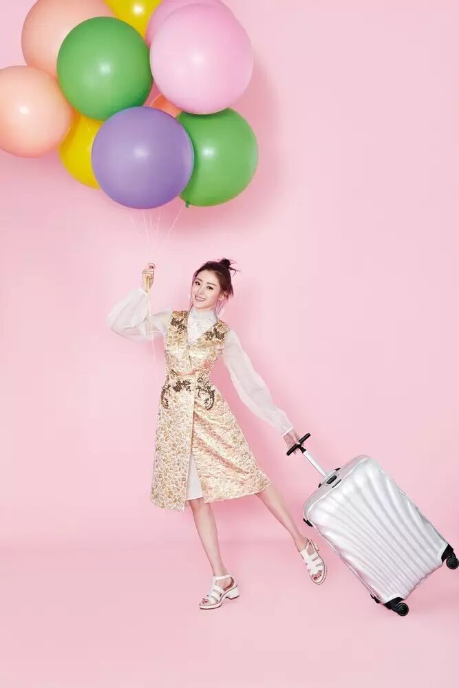 粉嫩的背景与可爱的气球,张天爱身着Dolce&Gabbana白色薄沙衬衫与金色刺绣连衣裙,青春气息爆棚。这套Look来自Dolce&Gabbana Cruise2016 NATALIE&CARRETTO系列。▼