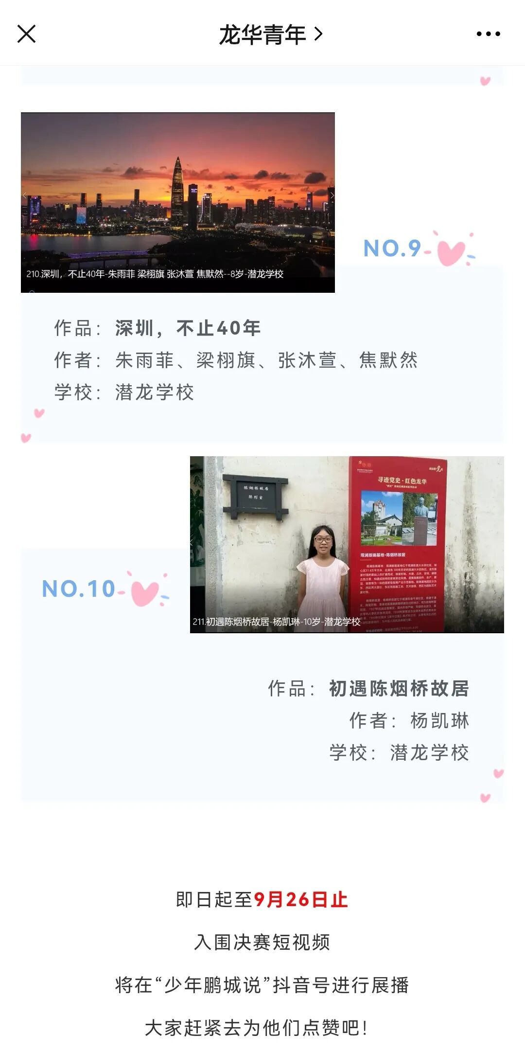 喜讯!由五年级三班同学杨凯琳参与拍摄的龙华少年说短视频《初遇陈烟桥陈故居》入围龙华区10强决赛!