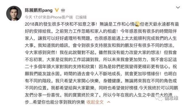 另外,不知道是因为陈展鹏结婚太突然,又或是结婚之后马上公布另一个喜讯,亦或是因为隐瞒了奉子成婚这件事,在公布了老婆有喜这个喜讯后,陈展鹏又立即在社交平台上,发表了一段很长的文字,其中就带有致歉的意思,还向大家说对不起,说他自己的婚讯会令很多人有不同的想法,令大家感到突然,并表示自己没有能力改变大家的想法。